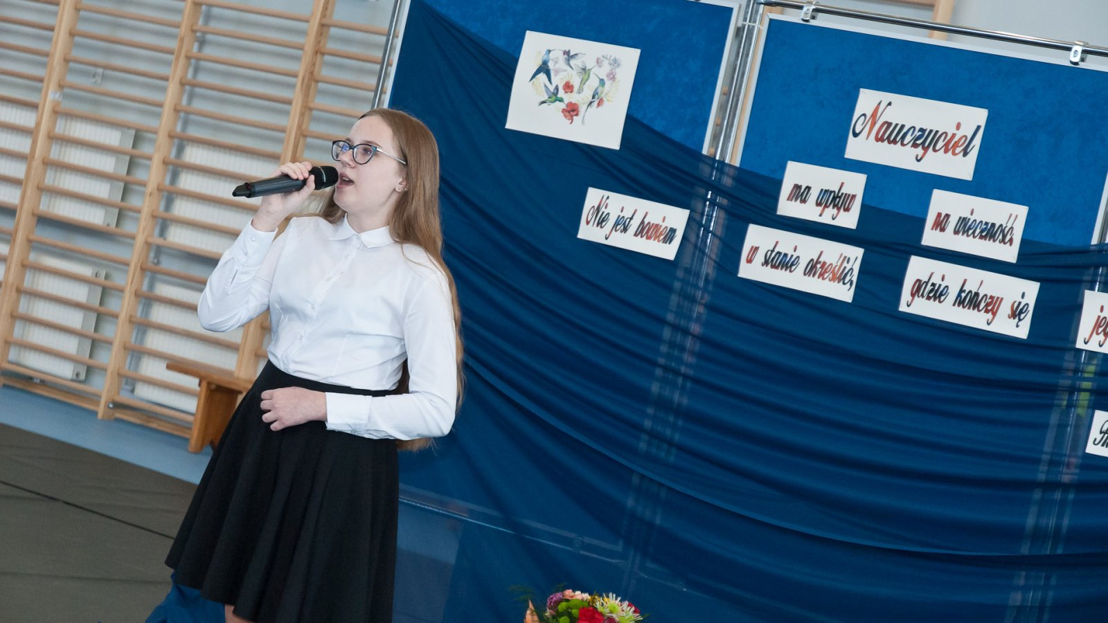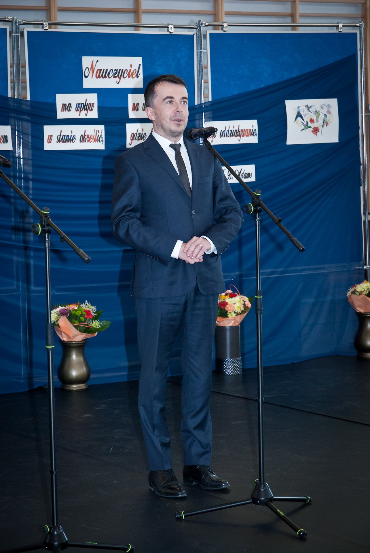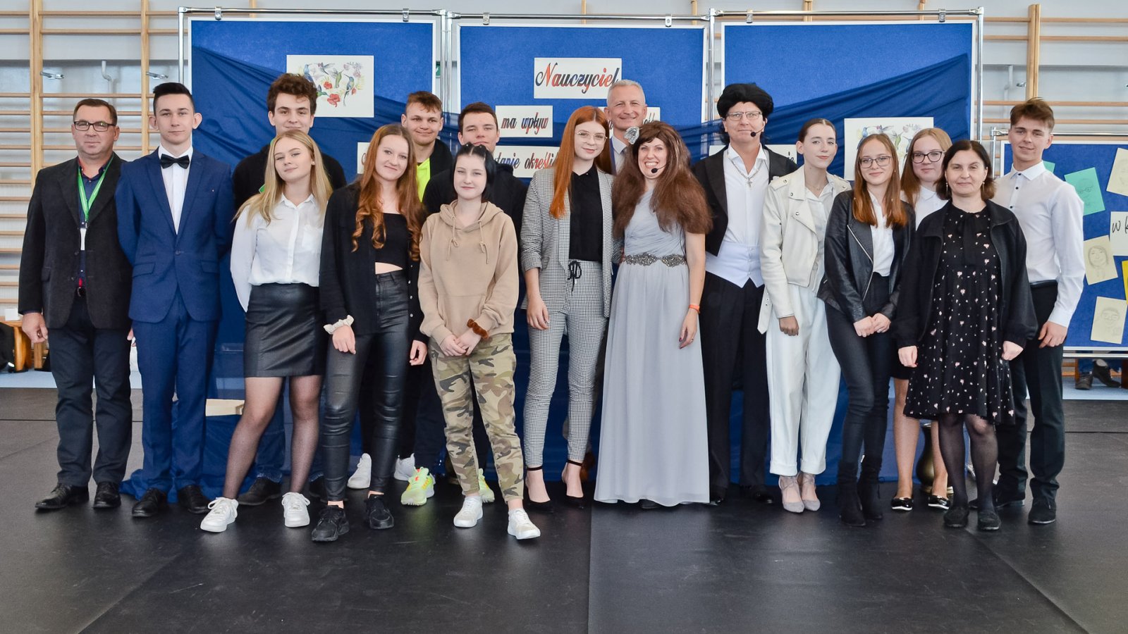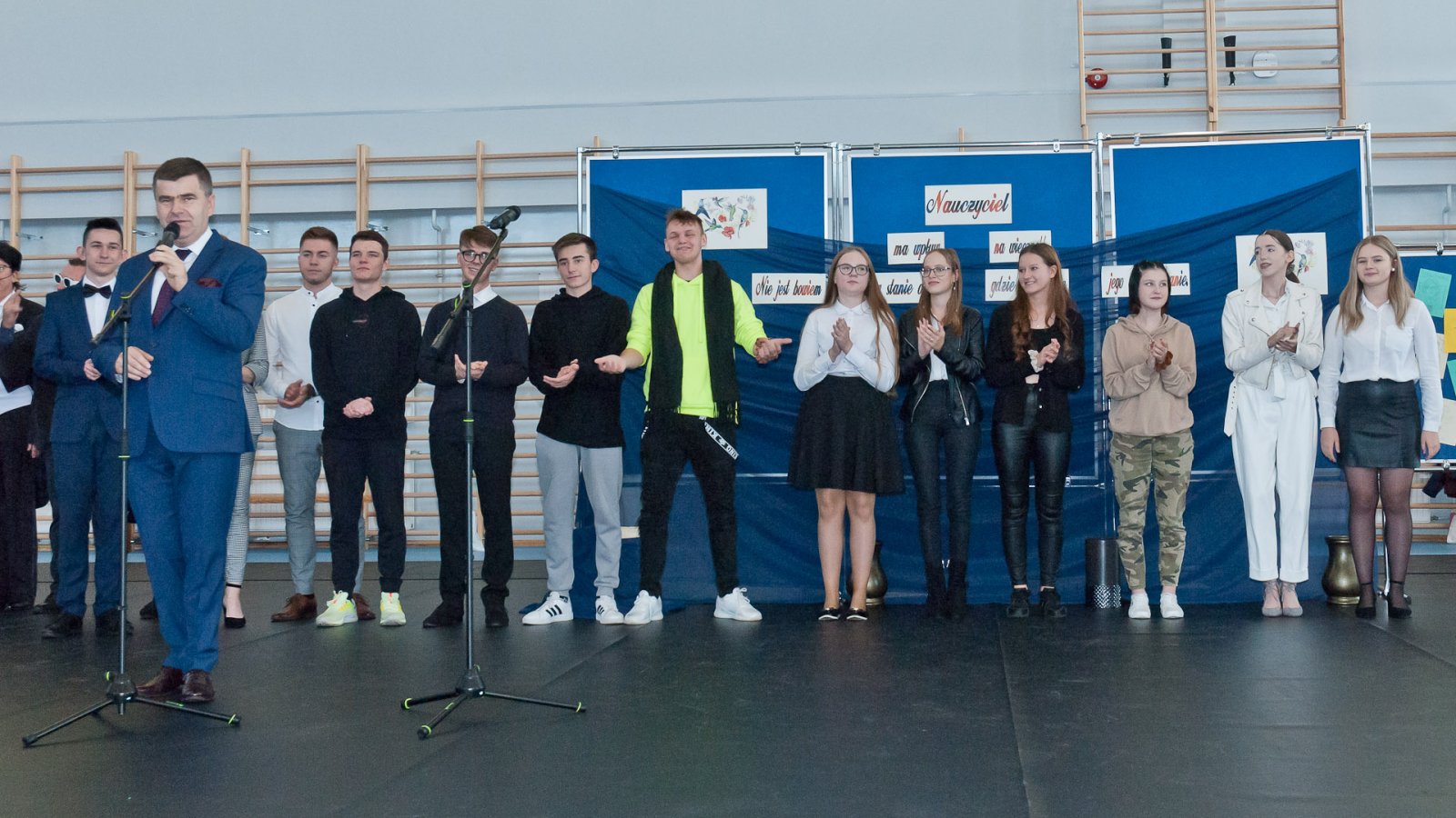 W hali sportowej zebrali się wszyscy uczniowie, dyrekcja, nauczyciele oraz zaproszeni goście. Życzenia wszystkim nauczycielom złożył dyrektor pan Stanisław Sitarz, starosta biłgorajski pan Andrzej Szarlip oraz przewodniczący Samorządu Uczniowskiego Bartłomiej Kaczor. Następnie wszyscy zebrani obejrzeli część artystyczną przygotowaną przez uczniów i nauczycieli.