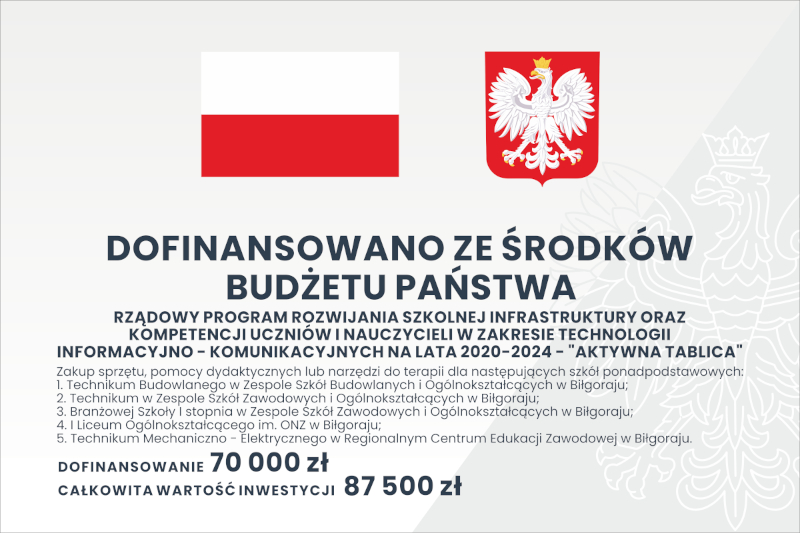 Środki pochodzą z Rządowego programu rozwijania szkolnej infrastruktury oraz kompetencji uczniów i nauczycieli w zakresie technologii informacyjno - komunikacyjnych na lata 2020-2024 -"Aktywna tab lica".