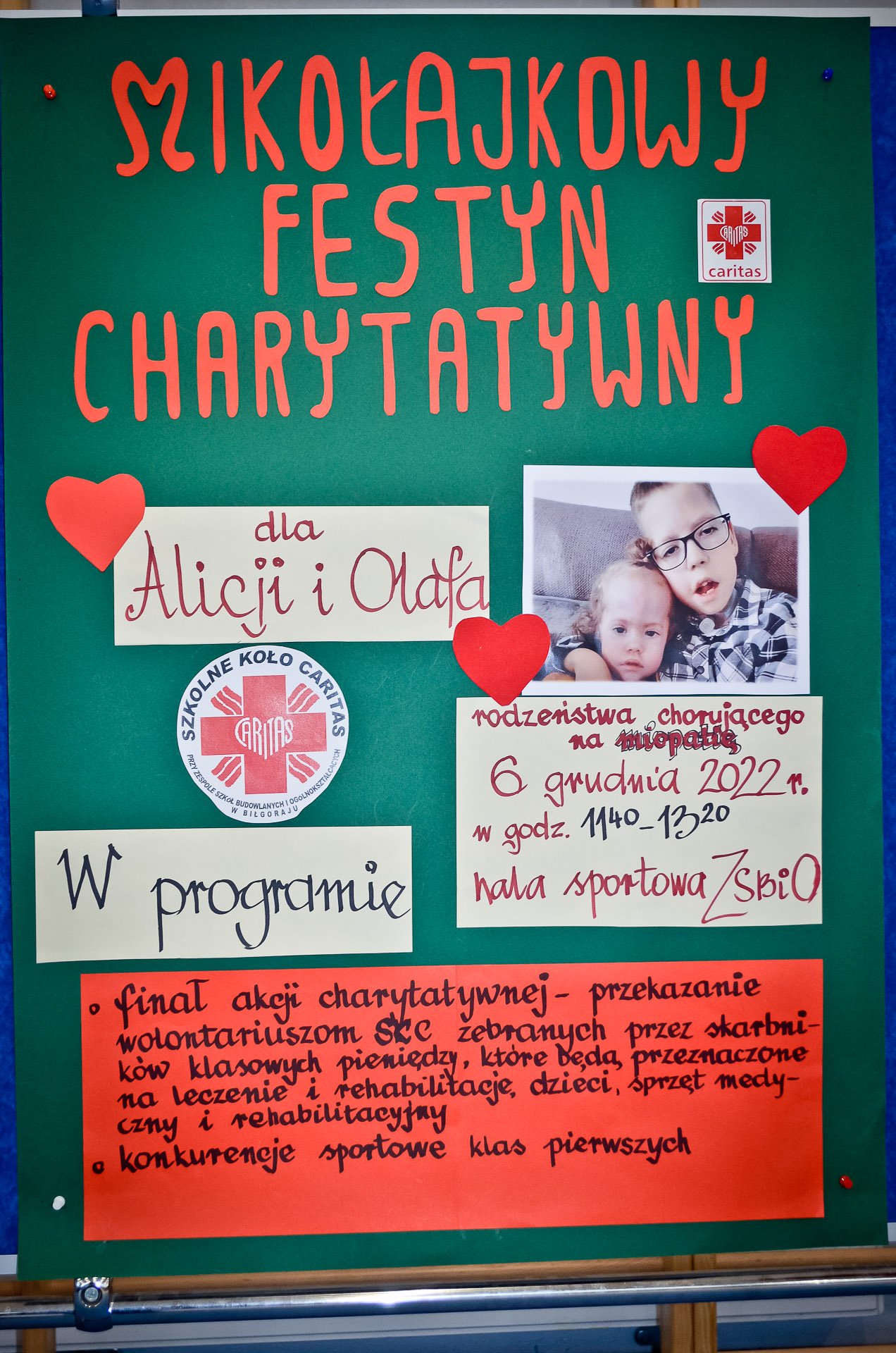 W tym roku zbieraliśmy pieniądze dla rodzeństwa Olafa i Alicji, dzieci chorują na miopatię. Udało się zebrać 10400 zł. i 6 euro. Wszystkim darczyńcom oraz uczniom biarącym udział w festynie serdecznie dziękujemy.