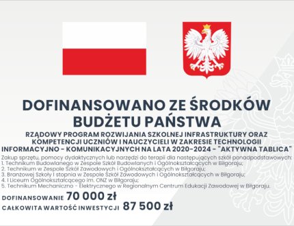 2022-11-09 Aktywna Tablica Powiat biłgorajski otrzymał wsparcie finansowe w ramach Programu „Aktywna tablica” Na podstawie umowy nr 56/AT/2022, zawartej 17 sierpnia br., z Lubelskim Kuratorem Oświaty, działającym w imieniu Wojewody Lubelskiego, powiat biłgorajski otrzymał wsparcie finansowe w wysokości 70 tys. zł. -