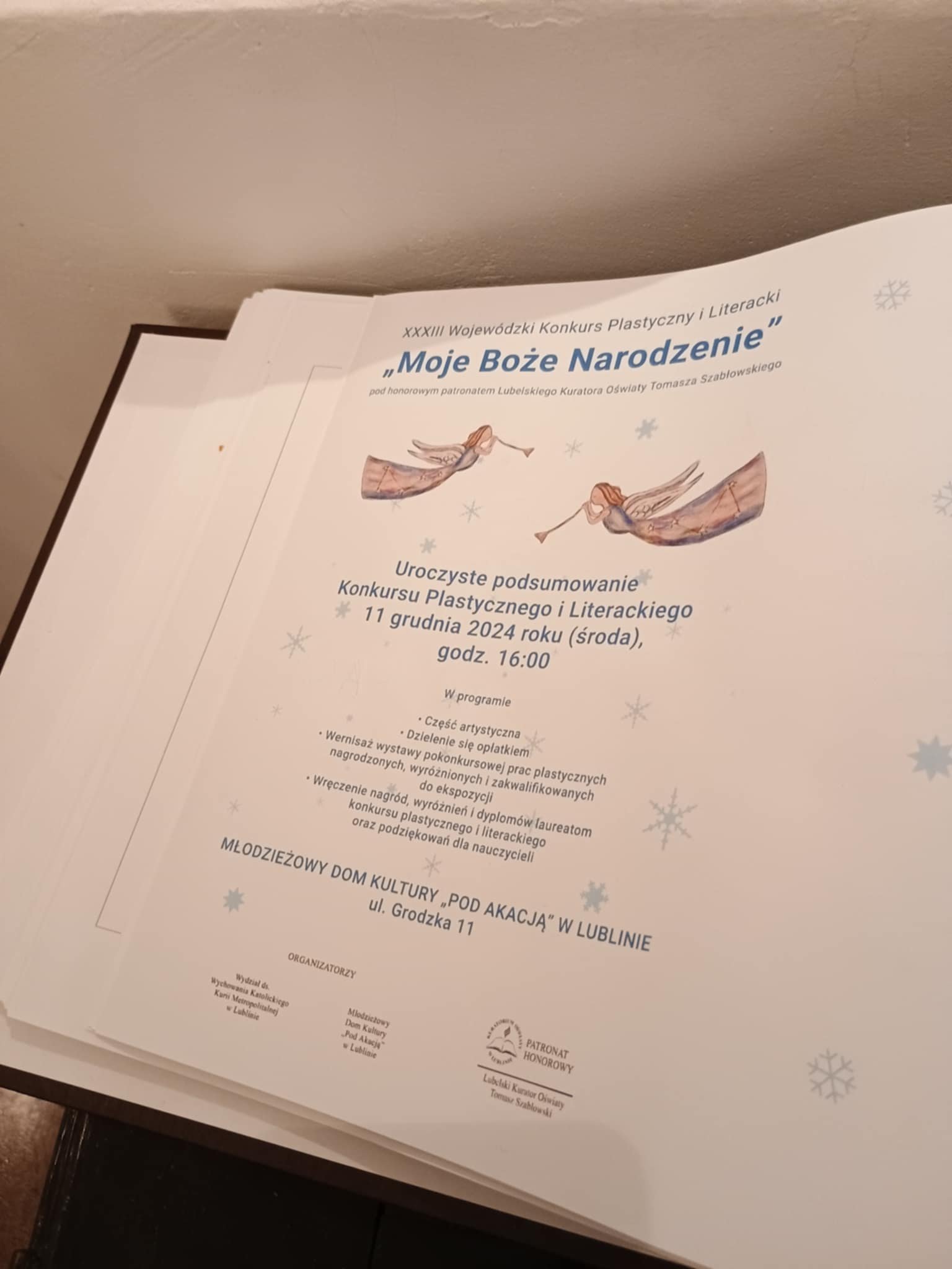 Laureaci wraz z opiekunami wzięli udział w uroczystym podsumowaniu konkursu 11 grudnia w Młodzieżowym Domu Kultury "Pod Akacją" w Lublinie. Zebrani mieli okazję obejrzeć część artystyczną, wernisaż wystawy pokonkursowej prac plastycznych oraz podzielili się opłatkiem. Głównym punktem spotkania stało się wręczenie dyplomów i nagród.