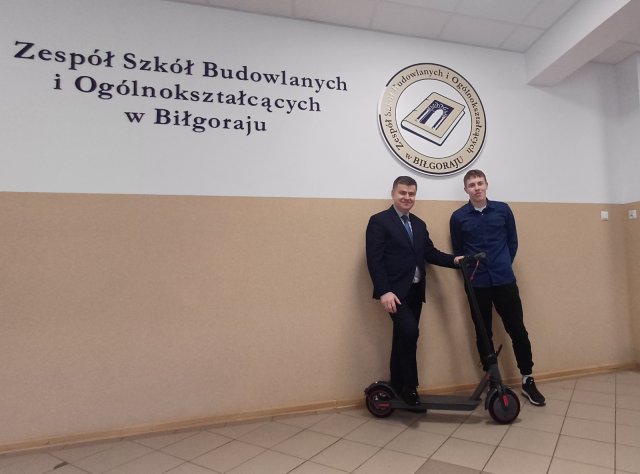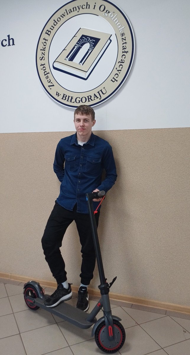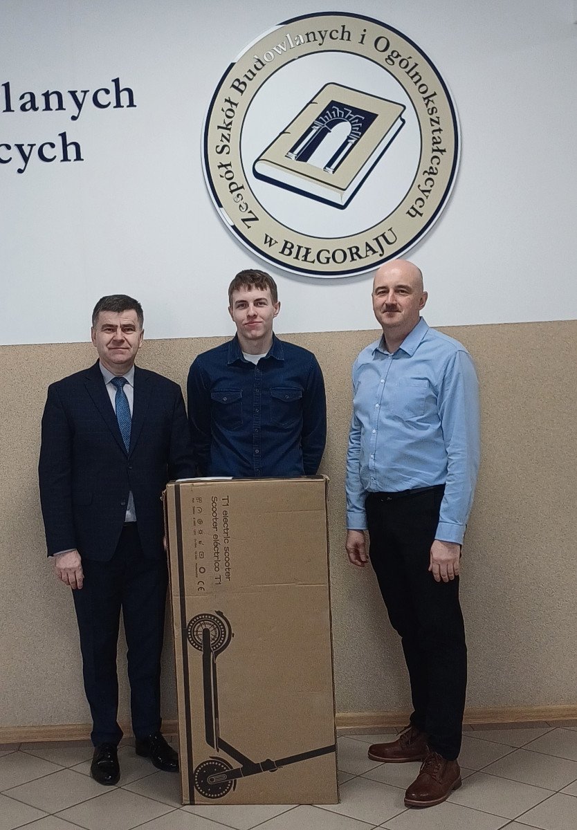 Kacper otrzymał od organizatorów konkursu nagrodę rzeczową - hulajnogę elektryczną. 5 lutego 2025 nagrodę w imieniu organizatora konkursu uczniowi wręczył Dyrektor ZSBiO w Biłgoraju Pan Stanisław Sitarz. Udział naszych uczniów w tego typu konkursach jest jedną z form rozwijania zainteresowań i podnoszenia matematycznych umiejętności, ale również szansą na zdobycie atrakcyjnych nagród. Gratulujemy Kacprowi i życzymy powodzenia w kolejnych konkursach, w których nasz uczeń bierze udział.