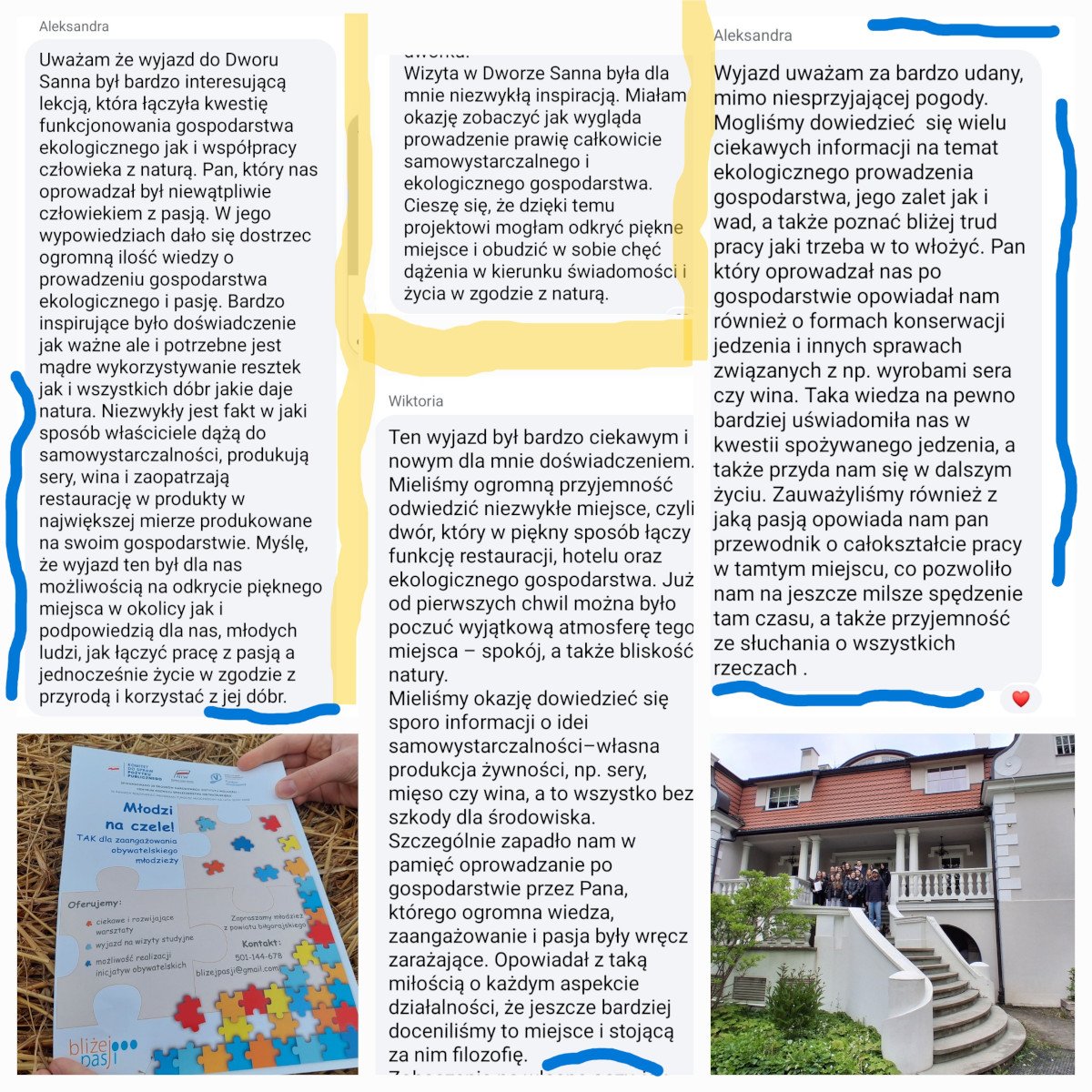 Dwór Sanna to hotel, restauracja, gospodarstwo, uprawa roślin, hodowla zwierząt, winnica, produkcja serów i win. Jego właściciele dążą, aby Dwór Sanna był w pełni samowystarczalnym i ekologicznym gospodarstwem. Przez dwie godzinny oprowadzał nas po tym miejscu Pan Karol Nizio, współwłaściciel Dworu Sanna, który z wielką pasją i entuzjazmem opowiadał nam, na czym polega idea samowystarczalności w prowadzeniu tak dużego gospodarstwa. Zajrzeliśmy do spiżarni z własnymi przetworami, do kuchni, w której nic się nie marnuje, do szklarni, do serowarni, do kóz i owiec, spacerowaliśmy po winnicy i rozległym parku. Teorię na temat ekologii przerobiliśmy tego dnia w praktyce. Na koniec mogliśmy posmakować kuchni Dworu Sanna, która oparta jest wyłącznie na produktach z własnego gospodarstwa. Dodatkowo, w ramach projektu „Dwór Sanna Zero” właściciele podejmują starania, aby restauracja nie generowała żadnych śmieci. Wszystko, co widzieliśmy i słyszeliśmy było niezwykle inspirujące. Wyjechaliśmy z pytaniem, co każdy z nas może i powinien zrobić dla Ziemi.