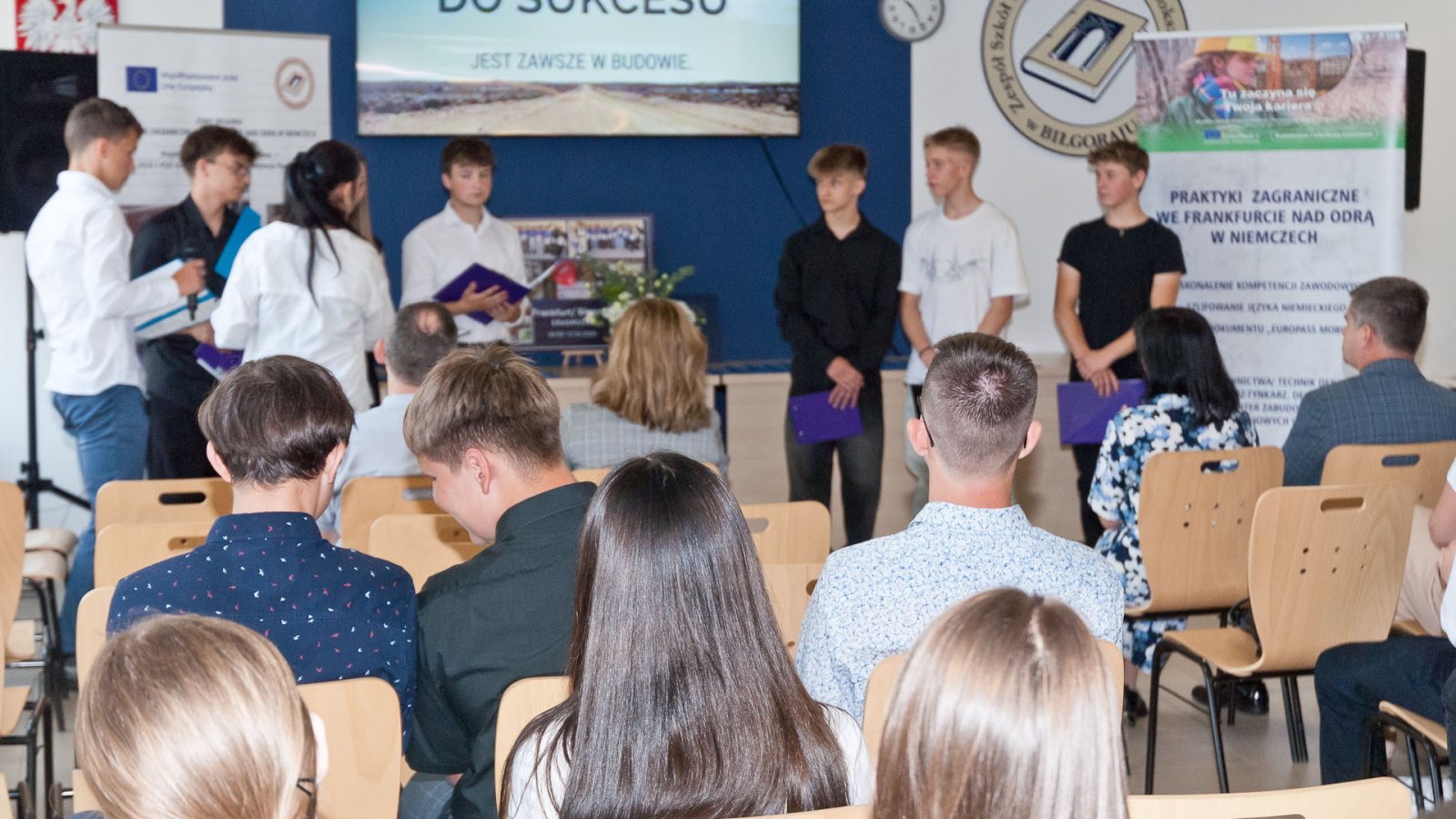 Po ukończeniu kursu uczestnikom zostały wręczone „Zaświadczenia” potwierdzające nabycie kompetencji językowych z języka niemieckiego ogólnego i branżowego. Uczestnicy projektu zostali również przygotowani do wyjazdu poprzez odbycie 3-godzinnego bloku zajęć pedagogiczno-psychologicznych, które przeprowadziła szkolna pedagog Pani Bożena Kurek oraz psycholog Pani Aneta Golba.