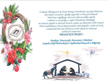 2024-12-20 Życzenia Bożonarodzeniowe Wesołych Świąt! Dyrekcja, Nauczyciele, Pracownicy i Młodzież Zespołu Szkół Budowlanych i Ogólnokształcących w Biłgoraju.