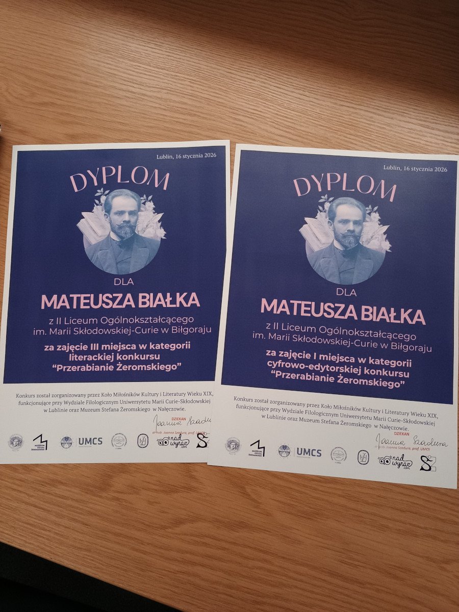 16 stycznia Mateusz odebrał też wyróżnienie w kategorii poezji dla uczniów szkół ponadpodstawowych przyznaną przez jurorów XXXIV Wojewódzkiego Konkursu Plastycznego i Literackiego „Moje Boże Narodzenie”. Organizatorem tego konkursu był Młodzieżowy Dom Kultury „Pod Akacją” w Lublinie.