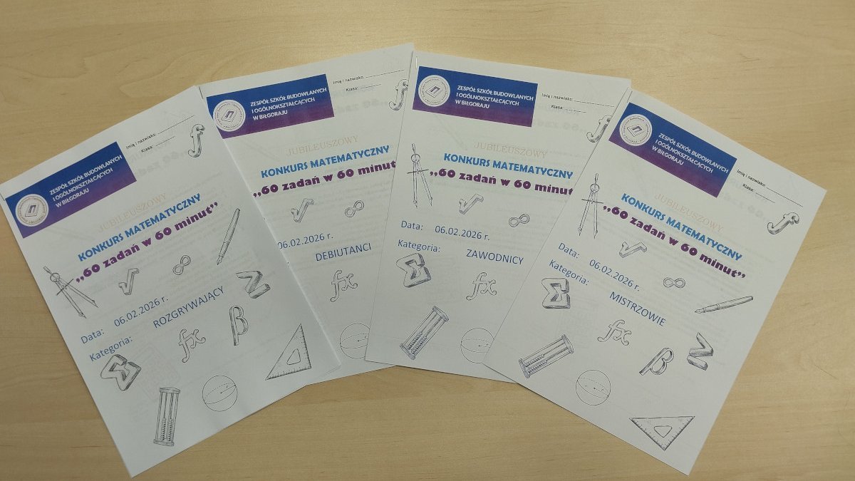 Konkurs matematyczny „60 zadań w 60 minut” to wyjątkowe wydarzenie zorganizowane w Zespole Szkół Budowlanych i Ogólnokształcących w Biłgoraju jako element przygotowań do obchodów jubileuszu 60-lecia szkoły, który przypada w 2026 roku.