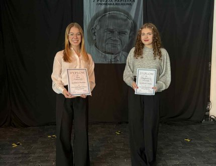 2025-10-20 Nagrody w konkursie recytatorskim 16.10.2025 Magdalena Klimek i Maja Czekirda z kl. 4dLO zaprezentowały się podczas XVIII Józefowskiego Spotkania z Poezją Papieską. Recytowały we fragmentach teksty Jana Pawła II: „Tryptyk rzymski” oraz „Wędrówkę do miejsc świętych”. Występy dziewcząt zostały nagrodzone odpowiednio II i III miejscem w grupie wiekowej szkół ponadpodstawowych. -