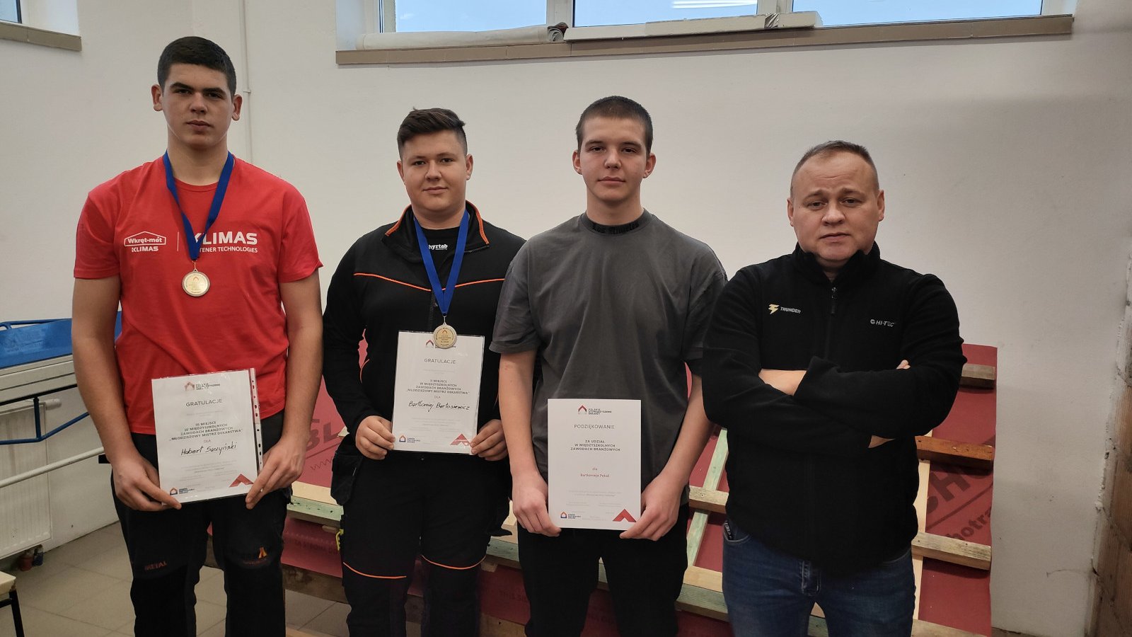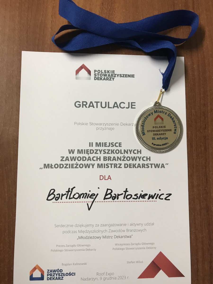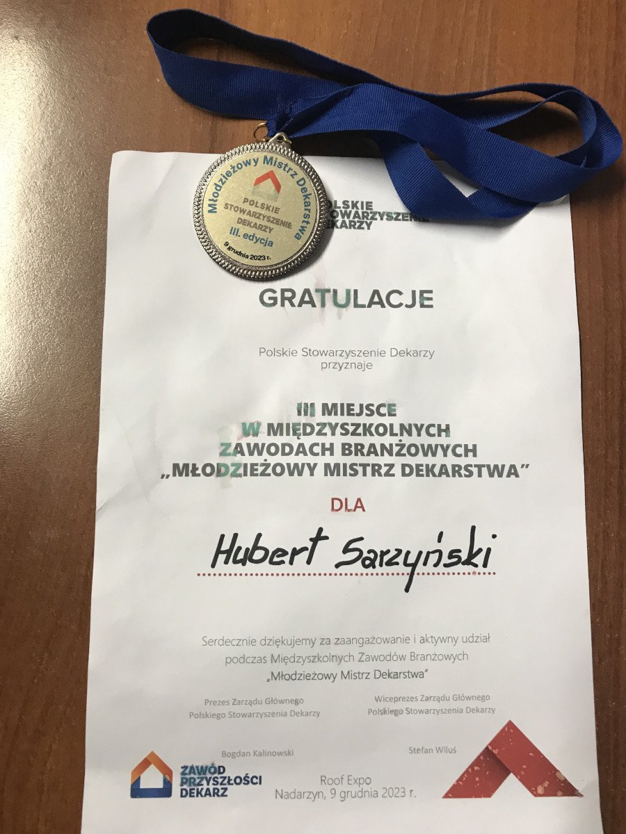 Zawodnicy wykonywali zadanie praktyczne w kategorii pokrycie dachu na rąbek. Po bardzo trudnej i wyczerpującej rywalizacji nasi uczniowie zostali pokonani tylko przez jednego zawodnika. Bartłomiej Bartosiewicz uplasował się na 2 pozycji zaś 3 miejsce zdobył Hubert Sarzyński, wyróżnienie otrzymał Bartłomiej Pękala. Wszyscy uczniowie uczęszczają do klasy o profilu dekarskim w naszej szkole.