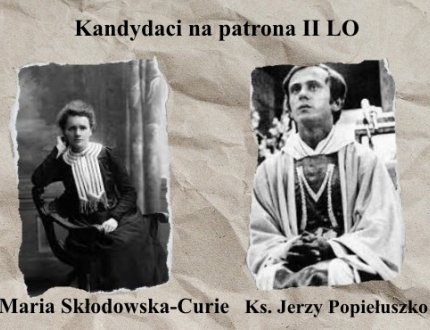 2024-01-10 Wybieramy patrona II LO Kandydatami na patrona II LO zaproponowanymi przez uczniów, nauczycieli, pracowników szkoły oraz rodziców są: Maria Skłodowska-Curie i Błogosławiony Ksiądz Jerzy Popiełuszko. -