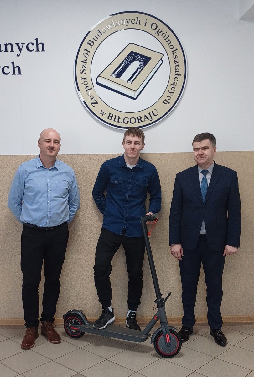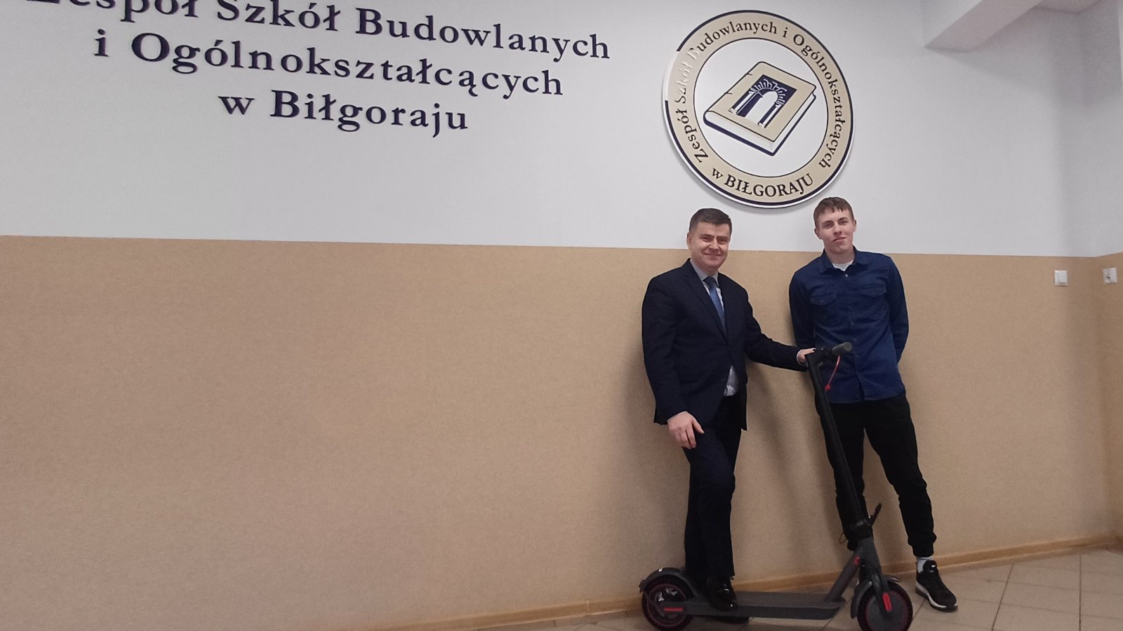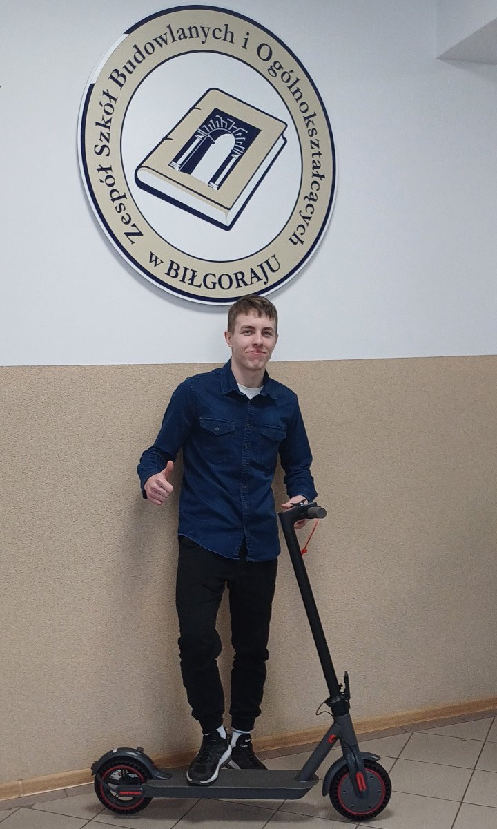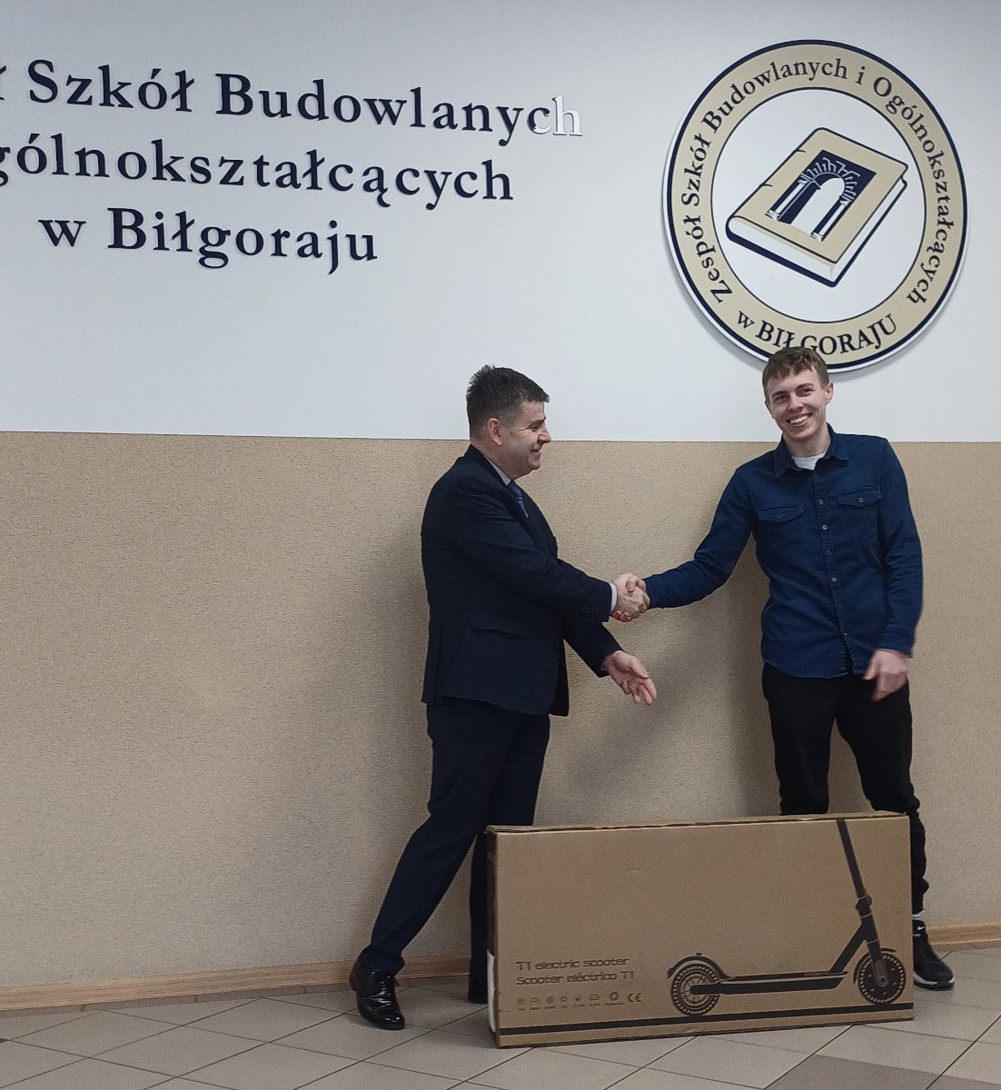 Kacper otrzymał od organizatorów konkursu nagrodę rzeczową - hulajnogę elektryczną. 5 lutego 2025 nagrodę w imieniu organizatora konkursu uczniowi wręczył Dyrektor ZSBiO w Biłgoraju Pan Stanisław Sitarz. Udział naszych uczniów w tego typu konkursach jest jedną z form rozwijania zainteresowań i podnoszenia matematycznych umiejętności, ale również szansą na zdobycie atrakcyjnych nagród. Gratulujemy Kacprowi i życzymy powodzenia w kolejnych konkursach, w których nasz uczeń bierze udział.