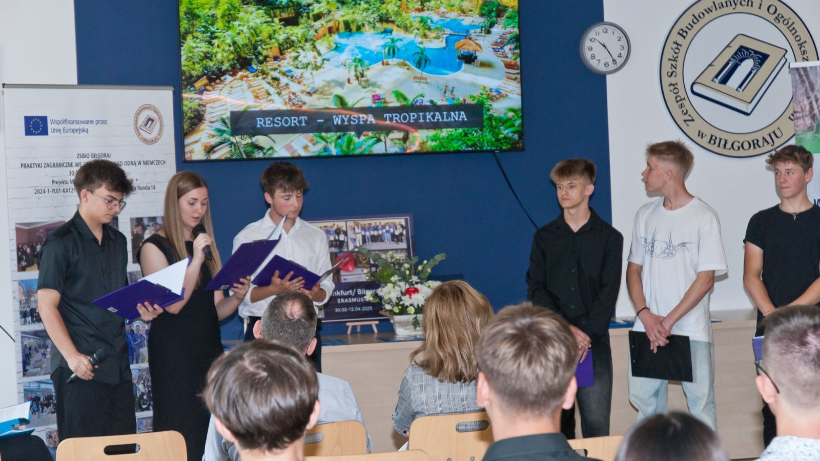 W dniu 18 czerwca 2025 roku zorganizowaliśmy uroczyste spotkanie podsumowujące działania projektowe, podczas którego uczestnicy praktyk zaprezentowali swoje doświadczenia i refleksje z pobytu w Niemczech: przedstawili prezentację multimedialną, film i zdjęcia ze stażu i pobytu w Berlinie, Poczdamie, Frankfurcie nad Odrą i Tropikalnej Wyspie.