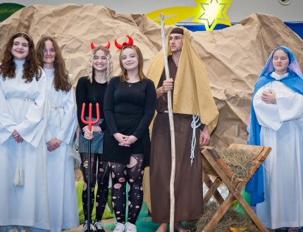 2024-12-21 Jasełka Bożonarodzeniowe Jasełka to widowisko o Bożym Narodzeniu, które od wieków wpisane jest w polską tradycję oraz corocznie jest wystawiane w naszej szkole. Tegoroczne Jasełka w naszej szkole zostały przygotowane przez ponad trzydziestu uczniów pod opieką katechety pana Mirosława Kity oraz ks. Mateusza Kozyry. -