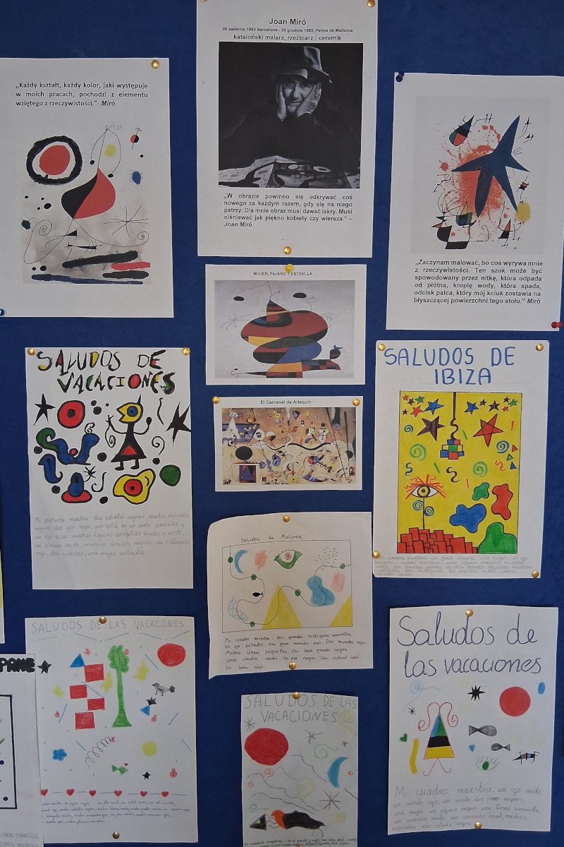 Na lekcjach języka hiszpańskiego poznaliśmy sylwetkę słynnego katalońskiego artysty Joana Miró, zgłębialiśmy jego niezwykłą twórczość i przy okazji uczyliśmy się nowego słownictwa. Opisywaliśmy jego obrazy po hiszpańsku oraz czytaliśmy krótkie opisy i na ich podstawie malowaliśmy. Tak oto język i sztuka połączyły siły!