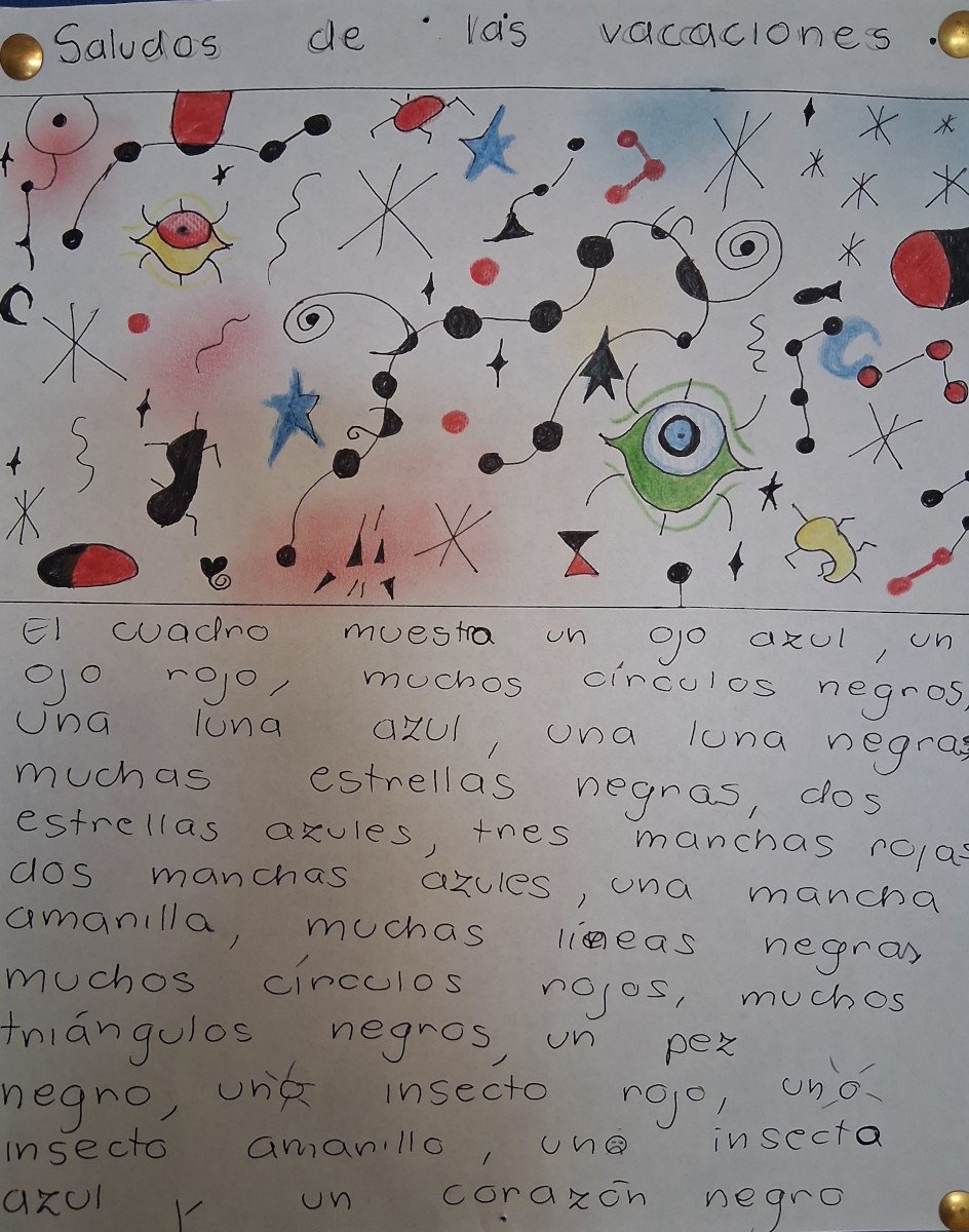 Finałem projektu był konkurs na pracę w stylu Miró pt. "Saludos de las vacaciones". Efekty? Kolorowe, pełne wyobraźni dzieła naszych uczniów w stylu Miró.
