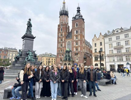 2025-10-19 Pielgrzymka wolontariuszy Szkolnego Koła Caritas do Sanktuarium Bożego Miłosierdzia w Krakowie 17 października 2025 r. wolontariusze SKC działającego przy ZSBiO w Biłgoraju (15 osób) pielgrzymowali do grobu św. Faustyny Kowalskiej, który znajduje się w Sanktuarium Bożego Miłosierdzia w Krakowie - Łagiewniki. Wolontariusze zapoznali się z życiem i posłannictwem św. Faustyny - sekretarki Bożego Miłosierdzia. Była również chwila by ucałować relikwie świętej i zanurzyć się w krótkiej modlitwie.